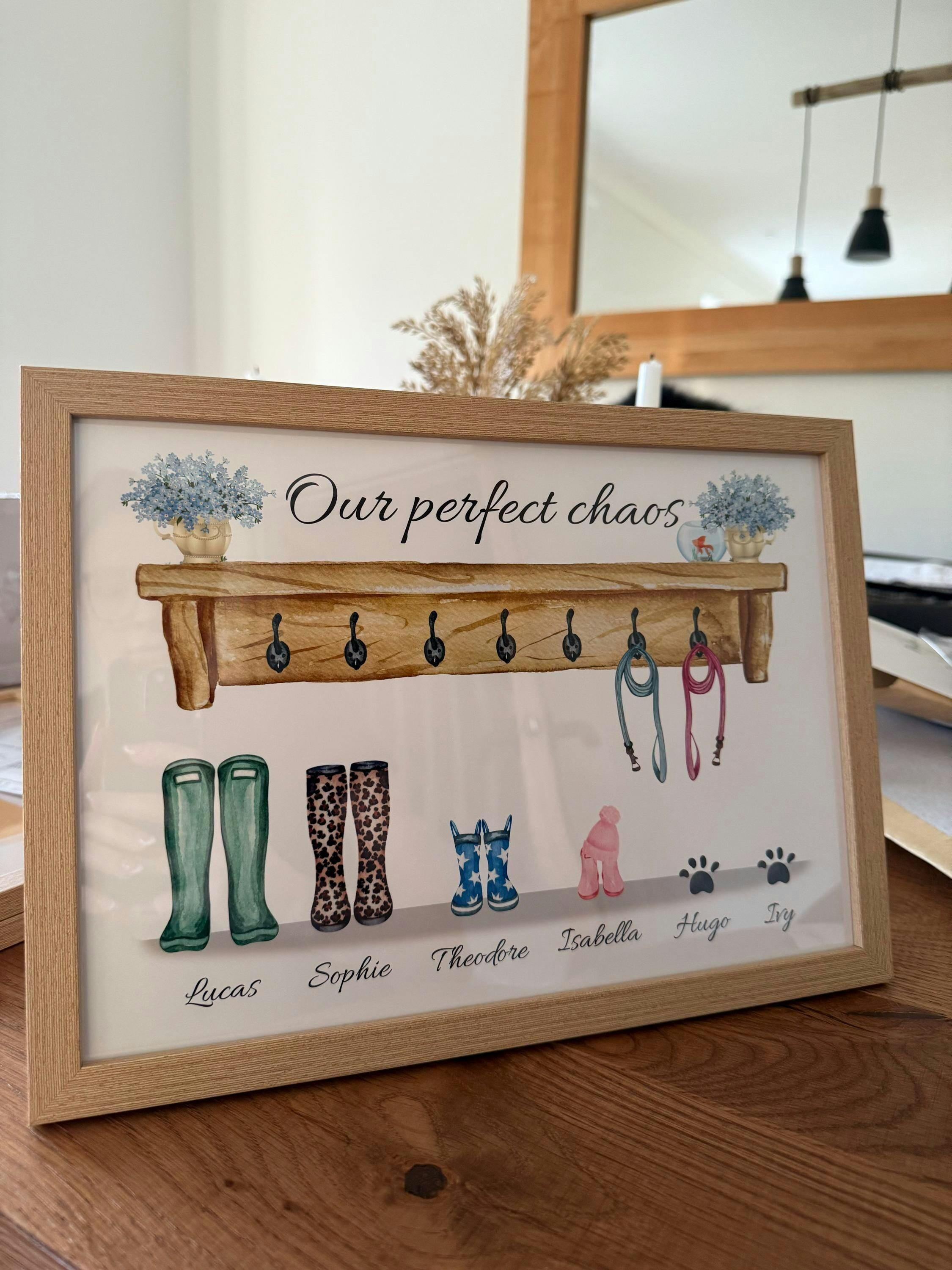 Celebrate the warmth and individuality of your family with this Personalised Family Print—a truly special piece of home decor that doubles as a heartfelt family gift idea. Thoughtfully designed with rustic accents and charming details, it’s a wonderful way to showcase each family member (including pets!) in a timeless illustration.